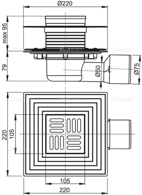 Сливной трап AlcaPlast 105 ? 105/50/75мм решетка - хром APV3344