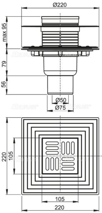 Сливной трап AlcaPlast 105 ? 105/50/75мм решетка - хром APV4344