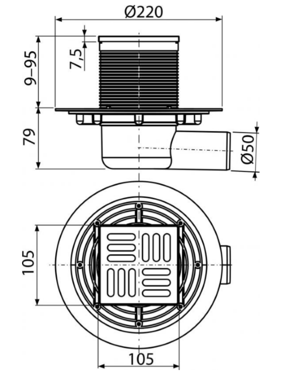 Сливной трап AlcaPlast 105 ? 105/50мм решетка - хром APV1321