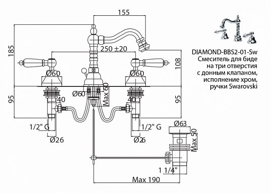 Смеситель для биде на три отверстия, бронза Cezares DIAMOND-BBS2-02-Sw