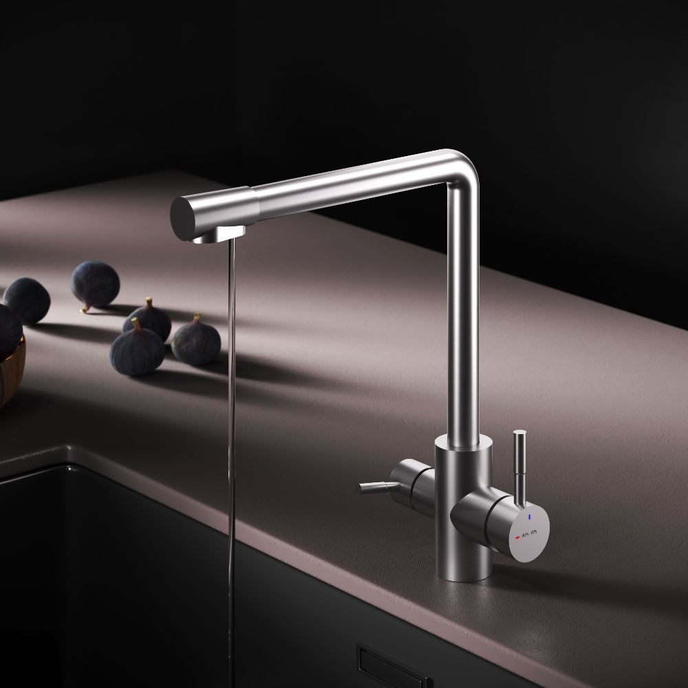 Смеситель оснащен встроенным каналом для питьевой воды. Для получения питьевой воды воспользуйтесь ручкой, расположенной с левой стороны корпуса, для получения обычной воды, просто управляйте смесителем привычным способом.