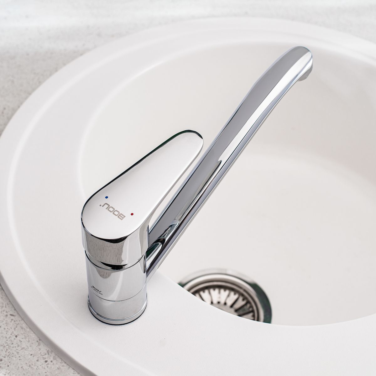 Однорычажный смеситель ТМ BOOU это классическая модель, которая украсит любую кух-ню. Удлиненный поворотный излив предназначен для оборудования габаритной раковины.