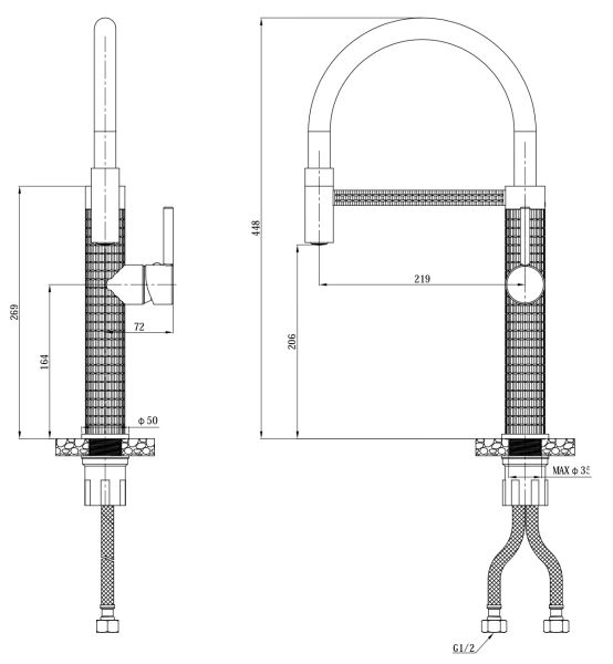 Смеситель Kitchen K51B: Стильный черный смеситель с гибким изливом 22 см. Матовый черный цвет добавит элегантности вашей кухне. Гибкий излив обеспечивает максимальное удобство при мытье посуды. Латунный корпус и надежный картридж 35 мм гарантируют долговечность.