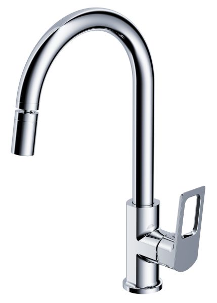 Стильный дизайн: хромированный корпус, R-образный излив.