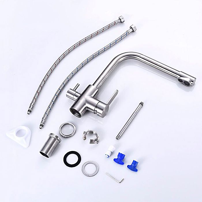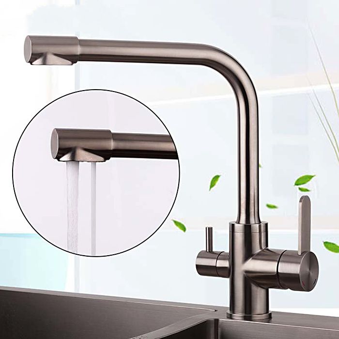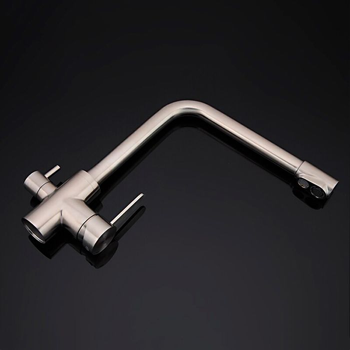 Смеситель для кухонной мойки Gappo G4399-1 с подключением фильтра питьевой воды - стильная и надежная однорычажная модель из нержавеющей стали с высоким поворотным изливом. Смеситель легок в установке, не требуется сверления дополнительных отверстий под фильтр: обычная и фильтрованная вода подаются через один излив. У смесителя 2 рычажка: крупный рычаг с плоской ручкой подает водопроводную воду, а второй компактный рычажок включает подачу воды из-под фильтра. Однорычажное управление обеспечивает плавную настройку температуры и регулировку напора воды. Цвет - хром.