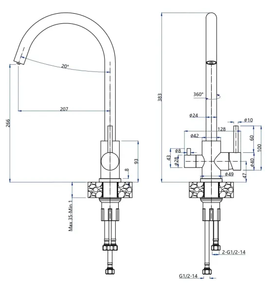 • Высота смесителя: