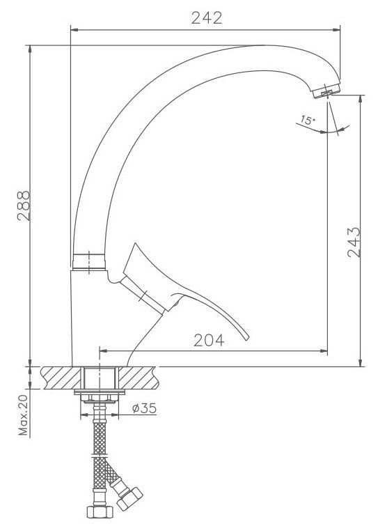 Смеситель для кухни бренда Haiba.Изготовлен из латуни.Картридж 35 мм.Укомплектован аэратором.Гибкая подводка 40 см.С поворотным изливом.