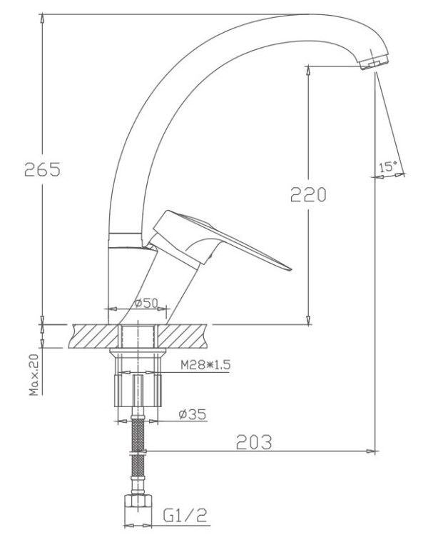 Смеситель для кухни бренда Haiba.Изготовлен из латуни.Картридж 40 мм.Укомплектован аэратором.Гибкая подводка 40 см.С поворотным изливом.