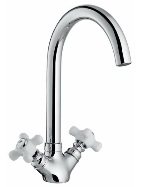 Смеситель для кухни бренда Haiba.Изготовлен из латуни.Укомплектован аэратором.Гибкая подводка 40 см.С поворотным изливом.Рукоятки управления белого цвета из керамики.