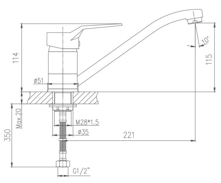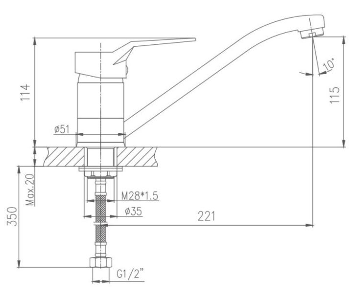 Смеситель для кухни бренда Haiba.Изготовлен из латуни.Картридж 40 мм.Укомплектован аэратором.Гибкая подводка 40 см.С поворотным изливом.