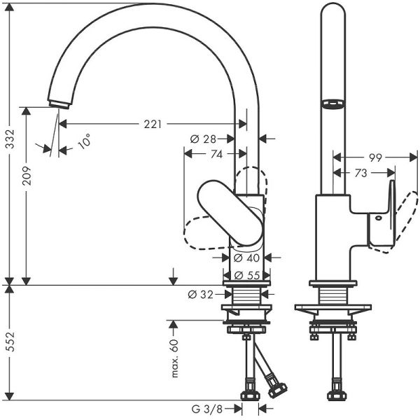 Угол поворота излива: 2 уровня на 120 или 360 градусов.