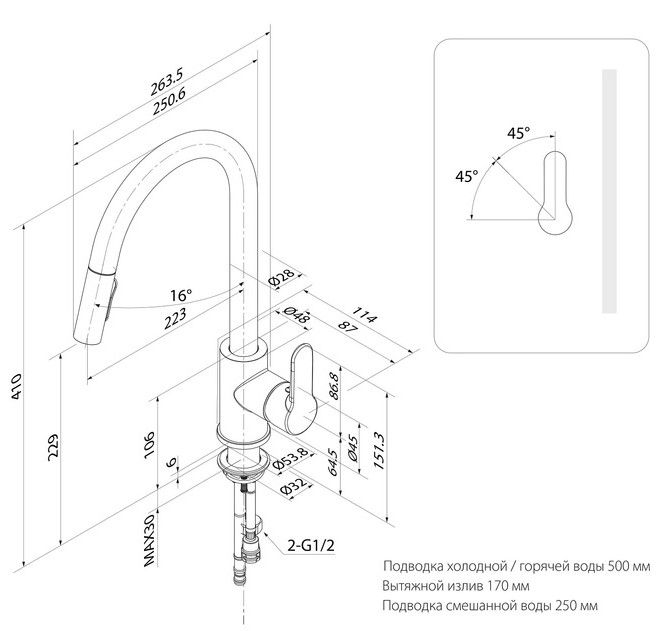 Угол открытия ручки – 90 градусов (45 градусов от себя – холодная вода, 45 на себя – горячая).