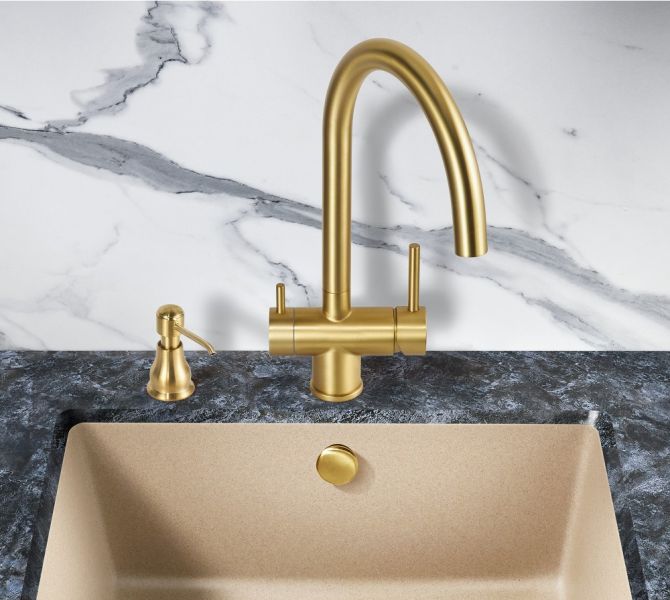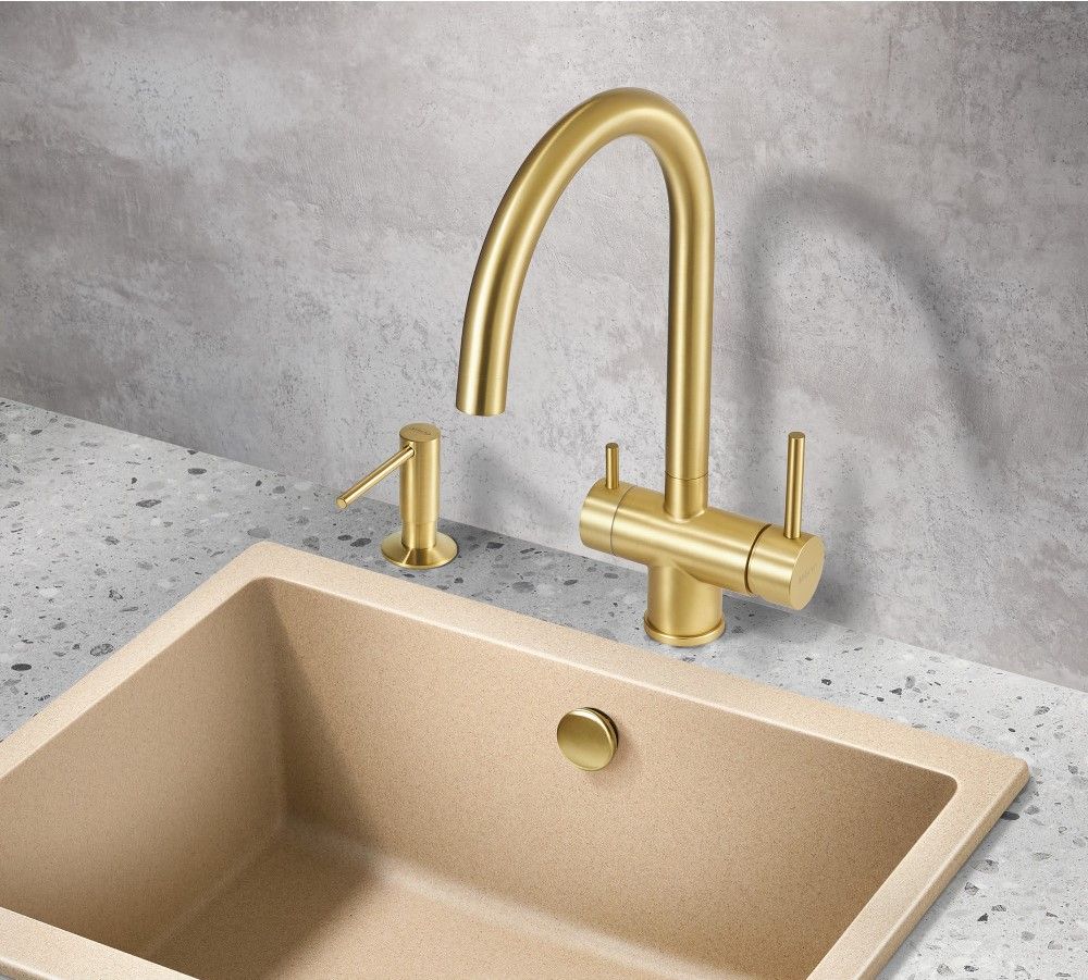 Смеситель для кухонной мойки Milacio Ultra (MCU.554.GD) из нержавеющей стали с PVD покрытием в цвете сатинированное золото, с возможностью подключения фильтра — стильное и высокофункциональное решение, которое выгодно подчеркнет все достоинства вашей кухни.