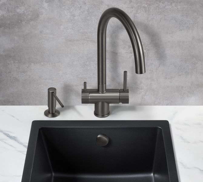 Смеситель для кухонной мойки Milacio Ultra (MCU.554.GM) из нержавеющей стали с PVD покрытием в цвете вороненая сталь, с возможностью подключения фильтра — стильное и высокофункциональное решение, которое выгодно подчеркнет все достоинства вашей кухни.