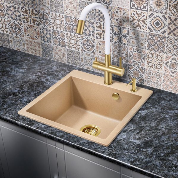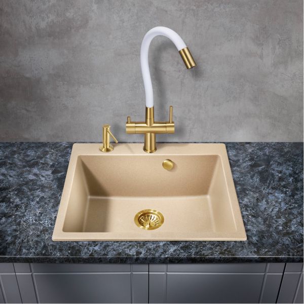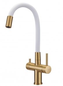 Модель выполнена в цвете брашированного золота и имеет изящный излив белого цвета, благодаря чему станет яркой, привлекающей внимание деталью на кухне и никого не оставит равнодушным.