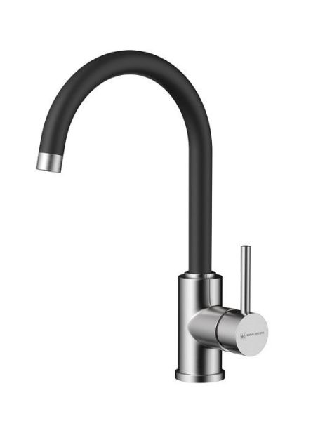 - Практичный однорычажный смеситель выполнен в современном стиле и снабжен высоким поворотным изливом.