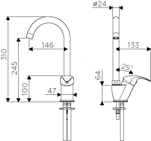 • Высота смесителя: