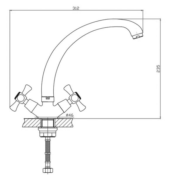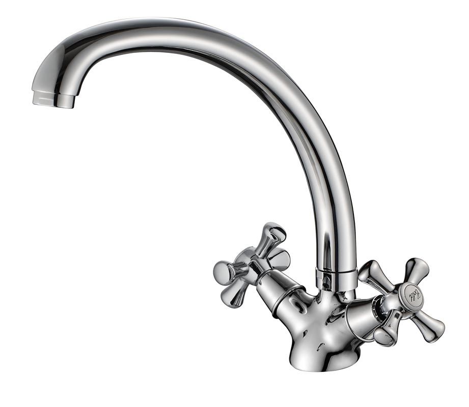 Двухвентильный смеситель для кухни с поворотным изливом. Изделие изготовлено из экологичной латуни, не выделяющей вредных веществ. Глянцевое хромовое покрытие устойчиво к коррозии и не тускнеет со временем. Для управления напором и температурой предусмотрено два вентиля с керамическими кран-буксами. Поворотный излив оснащен аэратором, обогащающим струю воздухом, что делает ее мягче и объемнее.