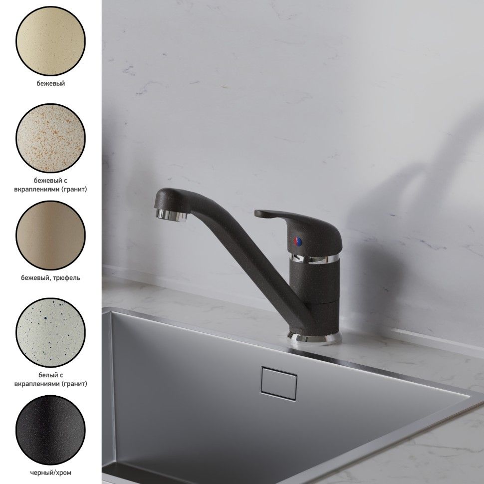 Все дело в цвете! Интересное решение для любителей традиционных моделей смесителей для кухни – PAINI JOLLY. Однорычажный смеситель с поворотным изливом обладает обтекаемой формой, знакомой и привычной многим. В этот раз этот популярный смеситель представлен в необычных цветах, что дает простор творчеству и позволяет сочетать его с мойками и кухонной мебелью разных фактур и материалов.Разнообразие цветаБелый с вкраплениями (гранит), комбинация черного и хромого цветов в корпусе смесителя, и три варианта бежевого цвета: сахара, бежевый с вкраплениями (гранит) и нежный трюфель. Теперь точно получится попасть в цвет столешницы и/или цвет мойки либо создать контрастные сочетания. Все варианты покрытия выполнены по специальной технологии, сохраняющей цвет и фактуру надолго и облегчающей уход за смесителем.Европейское качествоСделано в Италии. Гарантия – 5 лет.Технологии гарантируют долгий срок службыАэратор Neoperl наполняет поток воды кислородом, увеличивает напор, экономя воду. Одно движение пальцем для очистки сеточки. Nuovo Galatron - керамический картридж – основа, необходимая для долгой работы смесителя.Легкая уборкаМыльная губка и сухая тряпочка – все, что нужно для уборки. Несколько движений – и готово.
