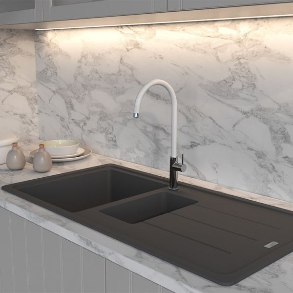 Однорычажный смеситель для кухни SKY от итальянского бренда PAINI сочетает в себе оптимальный набор функций и оригинальный дизайн. Черный цвет создаст ощущение высокого стиля и поддержит классический стиль оформления кухни или любое иное, выбранное вами, направление минимализма. Современная тенденция сочетания хрома и черного цвета в сантехнике - уже не вызов, а модное и практичное решение. Высокий поворотный излив позволяет менять направление потока воды, использовать глубокую посуду. Дизайн смесителя позволит ему выигрышно смотреться в кухнях с в стилях классика, модерн и фьюжн.