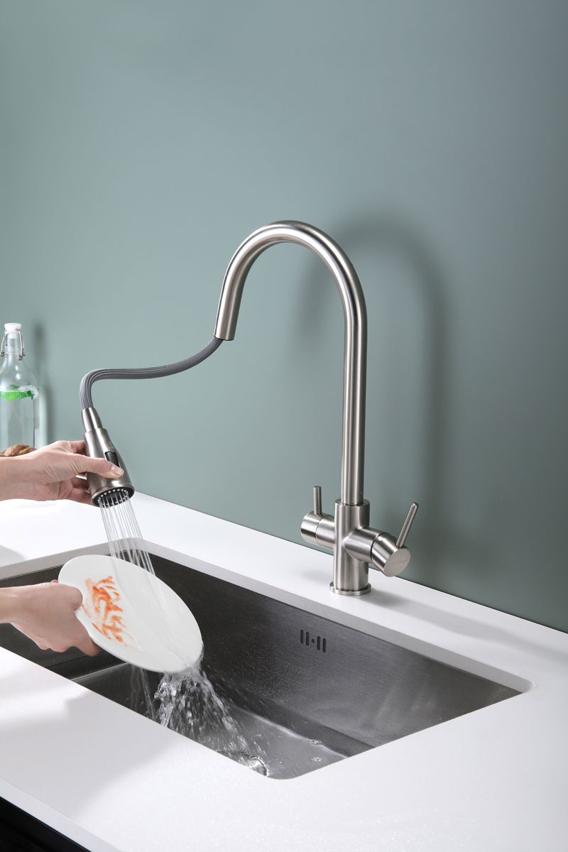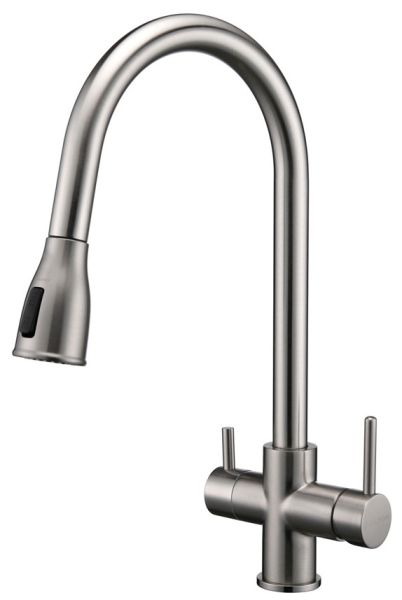 Смеситель под фильтрованную воду с выдвижным шлангом, артикул La214212-NIИзготовлен из высококачественной латуни, которая отвечает высочайшим европейским стандартам качества, не содержит свинца, не разрушается со временем и безопасна для здоровья.Вытяжной шланг