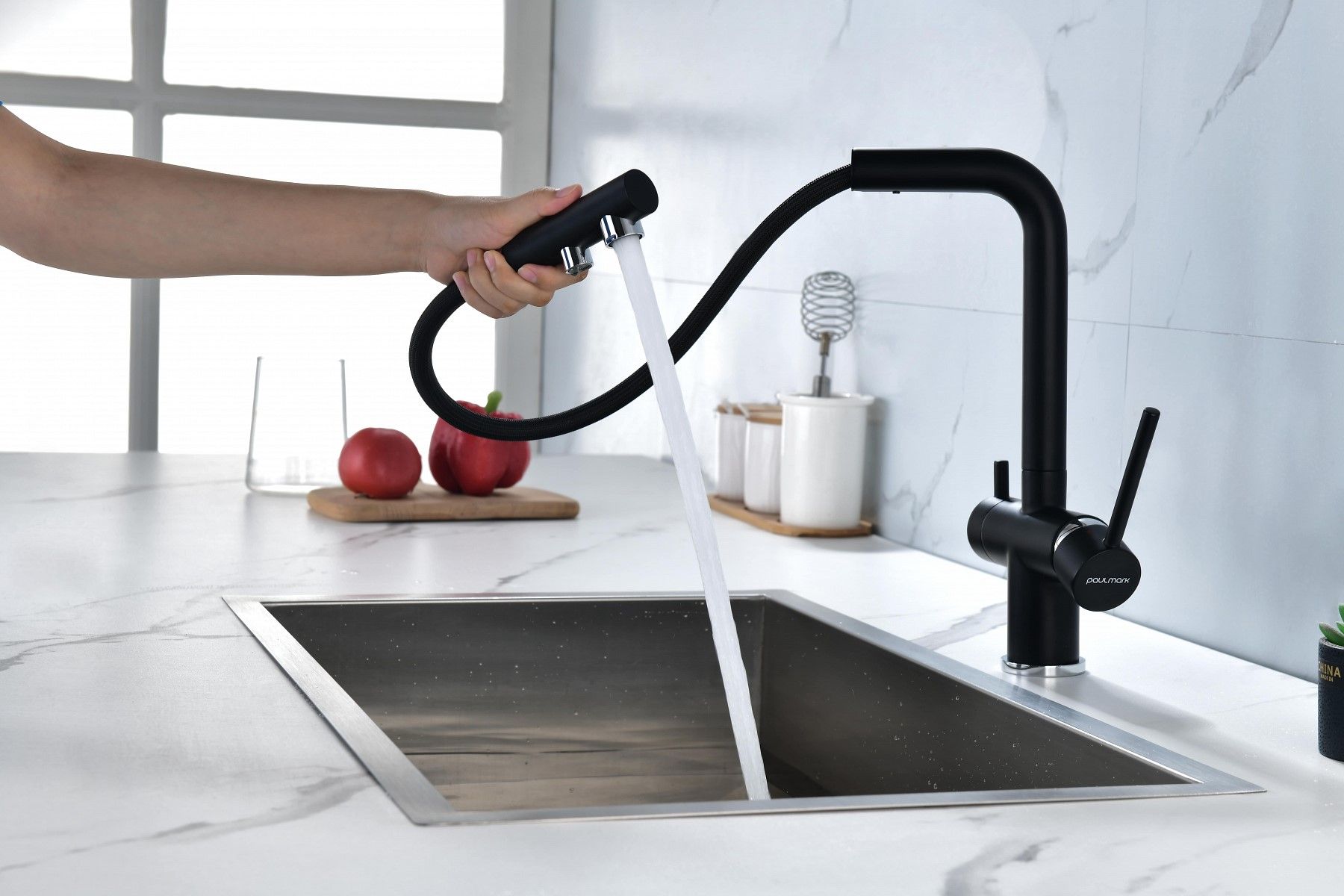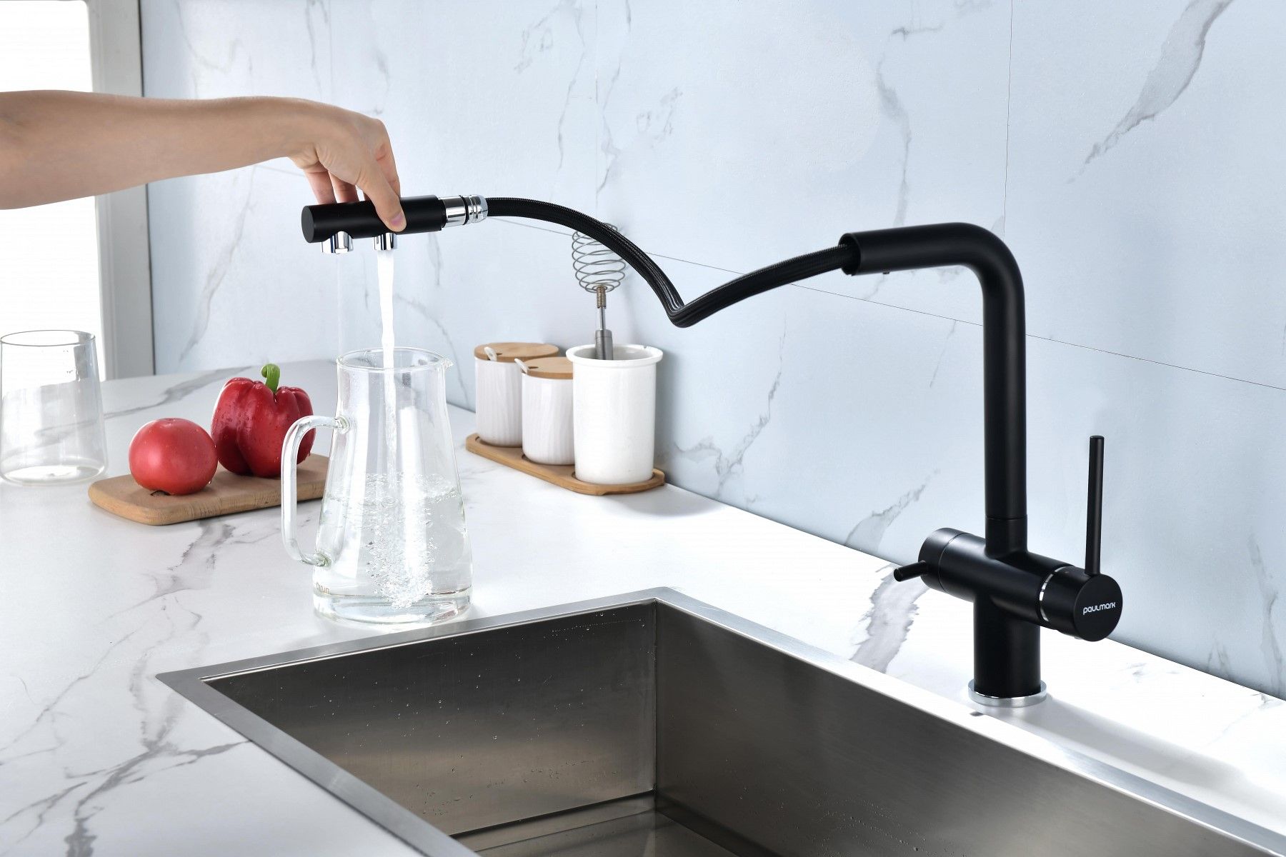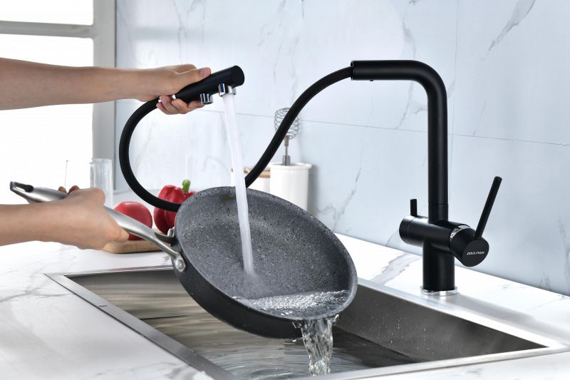 Смеситель оснащен гибким выдвижным изливом из нелойновой оплетки, которая обладает отличной устойчивостью к истиранию и разрушению. Данная техническая особенность расширяет рабочую зону смесителя, позволяя пользоваться им с удобством в больших мойках, мойках с двумя чашами, или наполнять водой ёмкость на столе рядом с мойкой, в том числе питьевой водой.