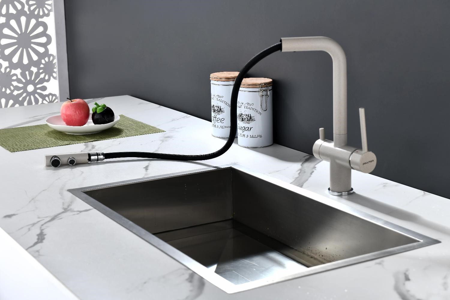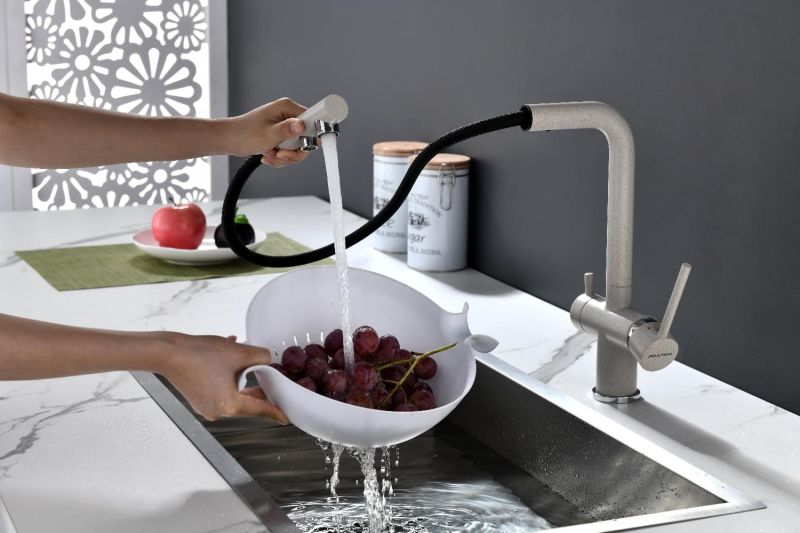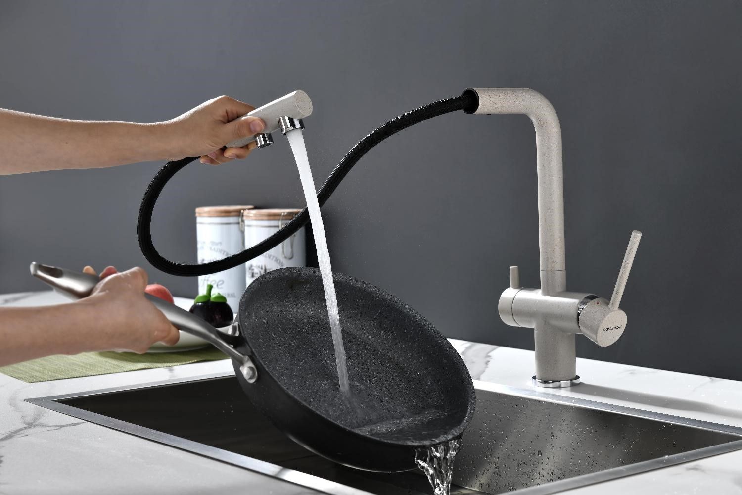 Смеситель оснащен гибким выдвижным изливом из нелойновой оплетки, которая обладает отличной устойчивостью к истиранию и разрушению. Данная техническая особенность расширяет рабочую зону смесителя, позволяя пользоваться им с удобством в больших мойках, мойках с двумя чашами, или наполнять водой ёмкость на столе рядом с мойкой, в том числе питьевой водой.