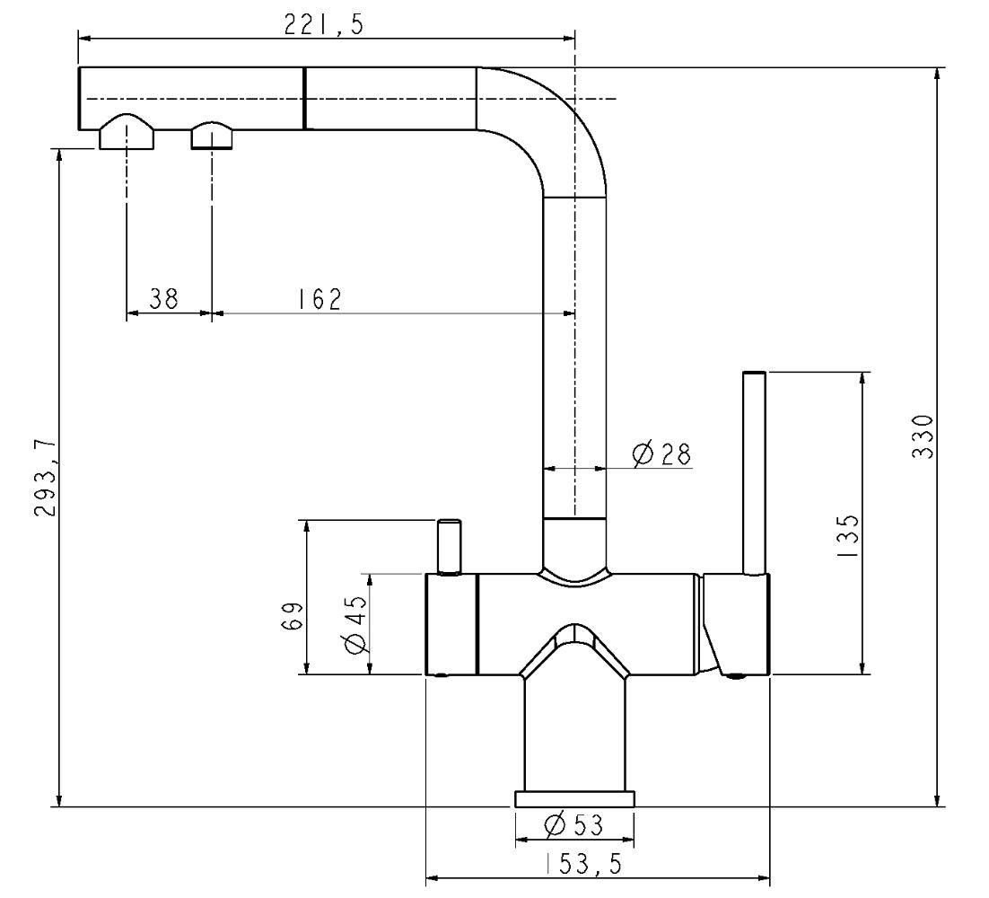 SERPENTINE оснащён функцией TRINKWASSER - излив смесителя имеет встроенный независимый канал для питьевой воды из фильтра, таким образом питьевая и водопроводная вода не смешиваются. Управление питьевой водой осуществляется отдельным рычагом, расположенным слева. Для пуска водопроводной воды используется большой рычаг справа.