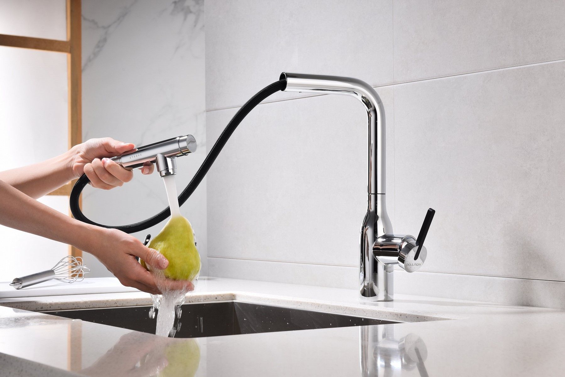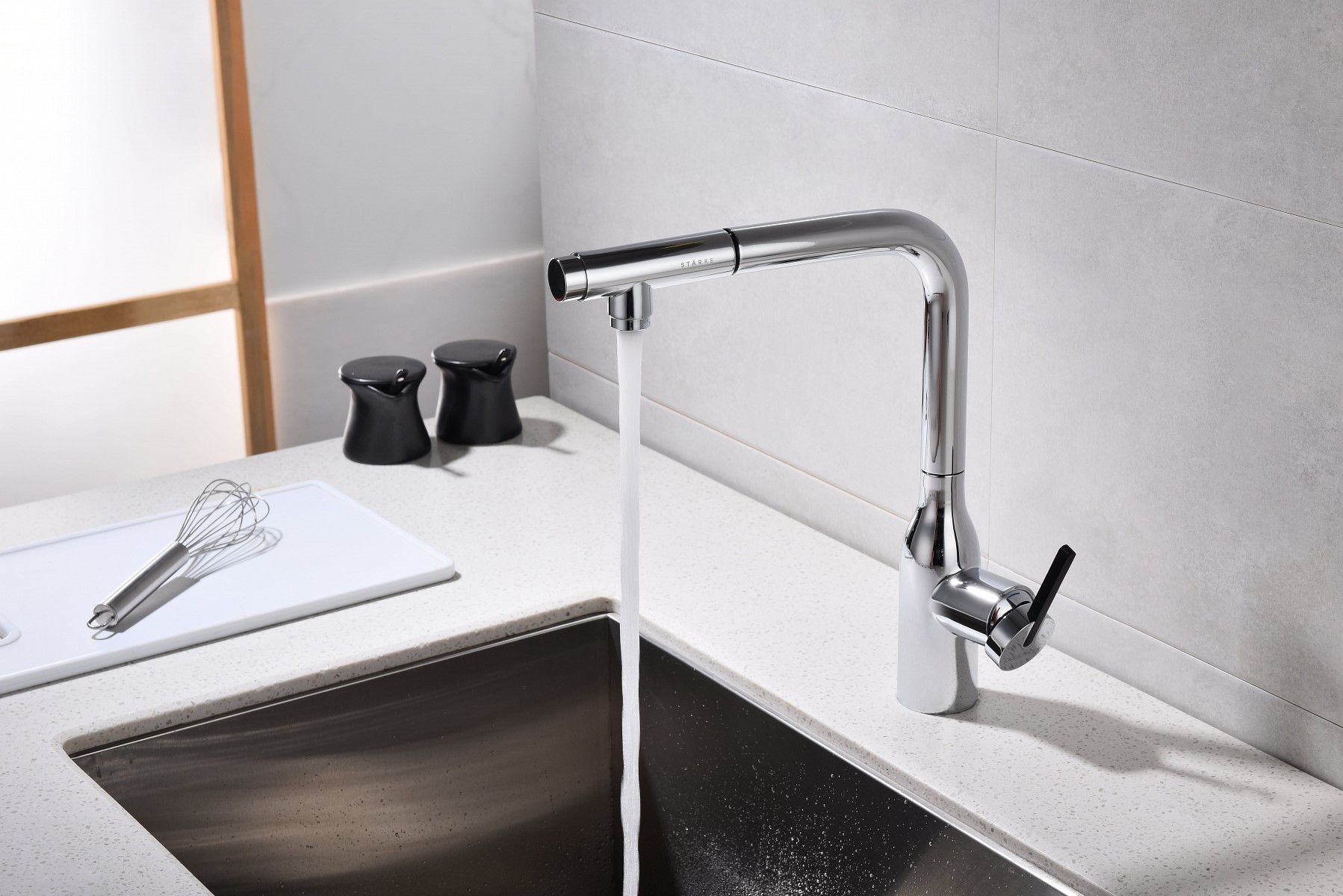 Высокий Г-образный излив с функцией вращения на 360 градусов обеспечивает удобство использования. Выдвижная часть излива способна обеспечить максимально комфортную эксплуатацию и экономный расход воды.