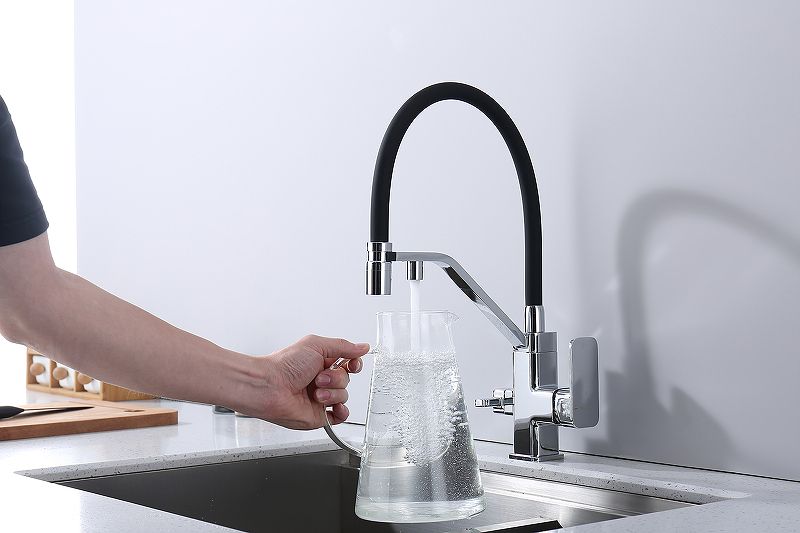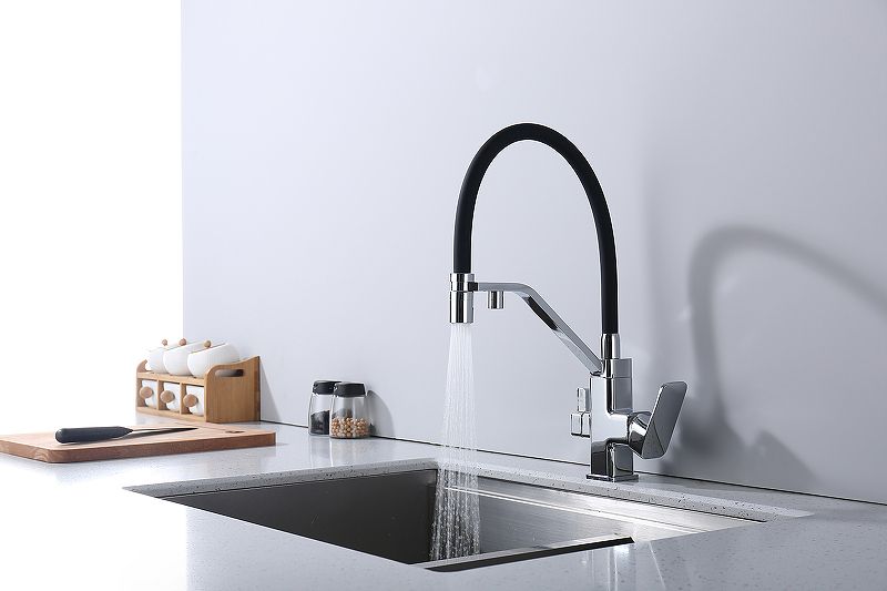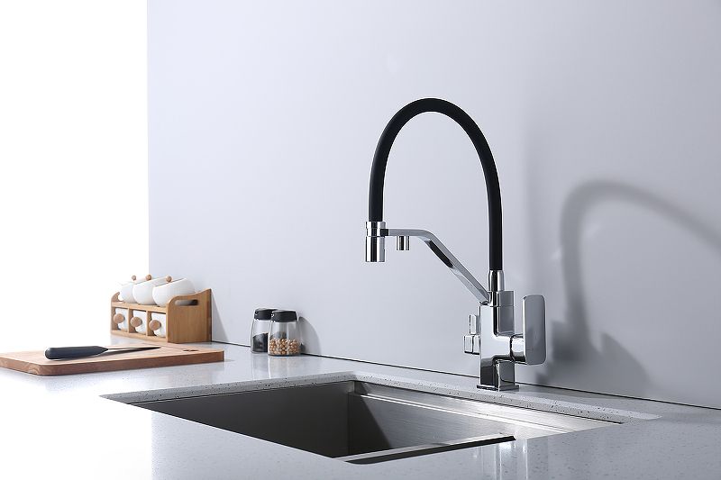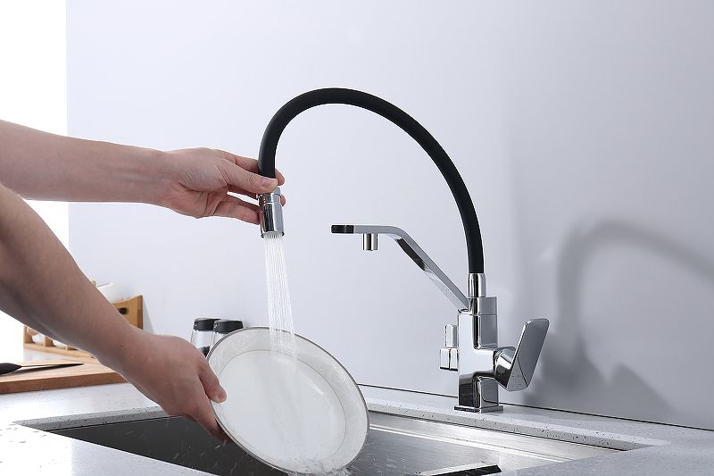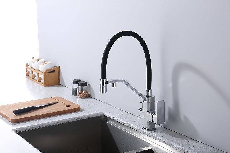 Смеситель для кухни с подключением к фильтру питьевой воды. Гибкий съемный шланг значительно расширяет зону использования смесителя, благодаря этому можно мыть объемную посуду. Модель предназначена для одновременного подключения к водопроводу и фильтру и позволяет снабжать как обычной, так и питьевой водой.
