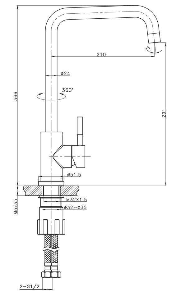 RP-013, цвет хромСмеситель латунный, 2 шт гибкие подводки, картридж 35мм