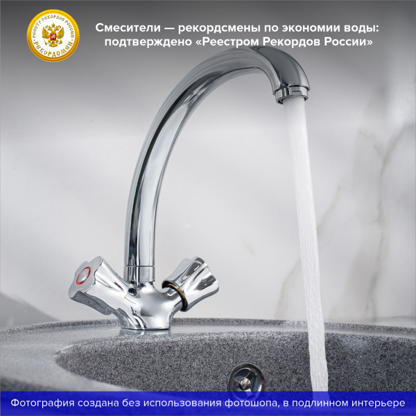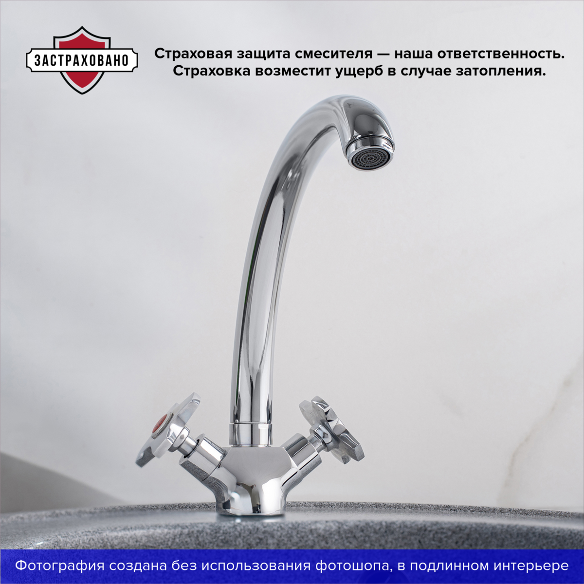 Привлекательный двуручковый смеситель для кухни в классическом исполнении, обладает удобными в использовании ручками регулирования температуры и напора воды.