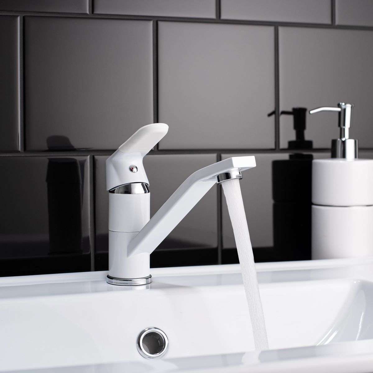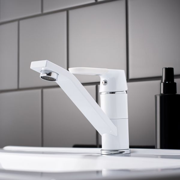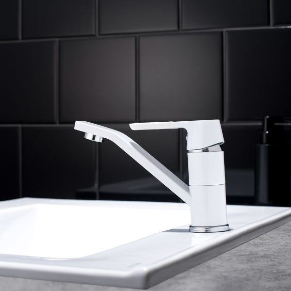 Надежный одноручковый смеситель для кухни с коротким поворотным изливом — это не только удобство в использовании, но и стильное сочетание белого и хромового покрытия.