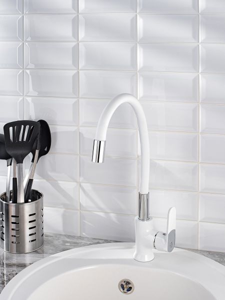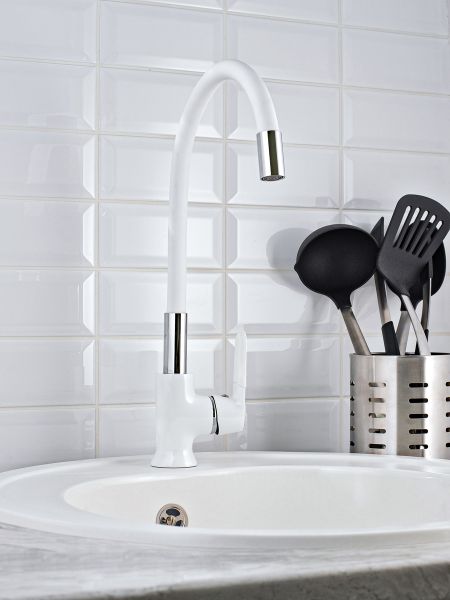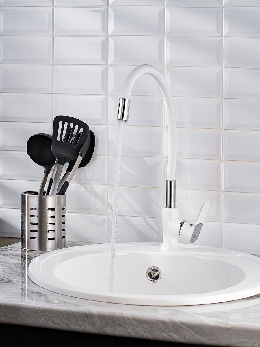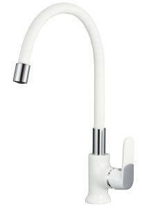 Стильный одноручковый смеситель для кухни с высоким гибким изливом эргономичен в использовании и эффектно подчеркивает интерьер за счет элегантного белого оттенка дизайна.