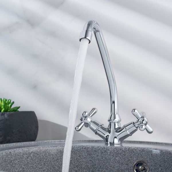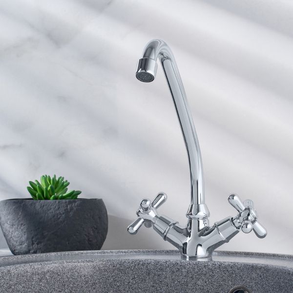 Двуручковый смеситель для кухни с высоким поворотным изливом, изогнутым в форме J.