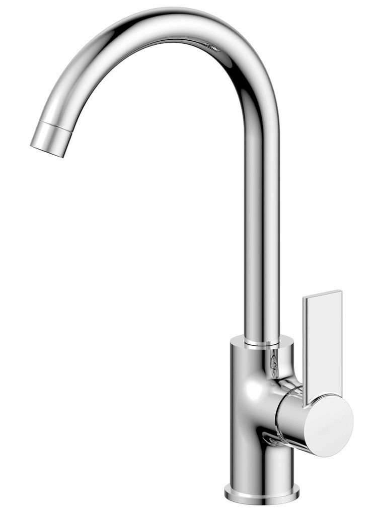 Стильный и лаконичный однорычажный смеситель для кухни с высоким поворотным изливом.