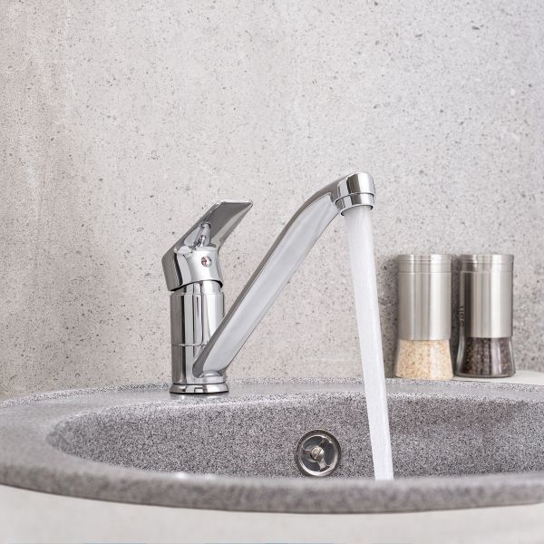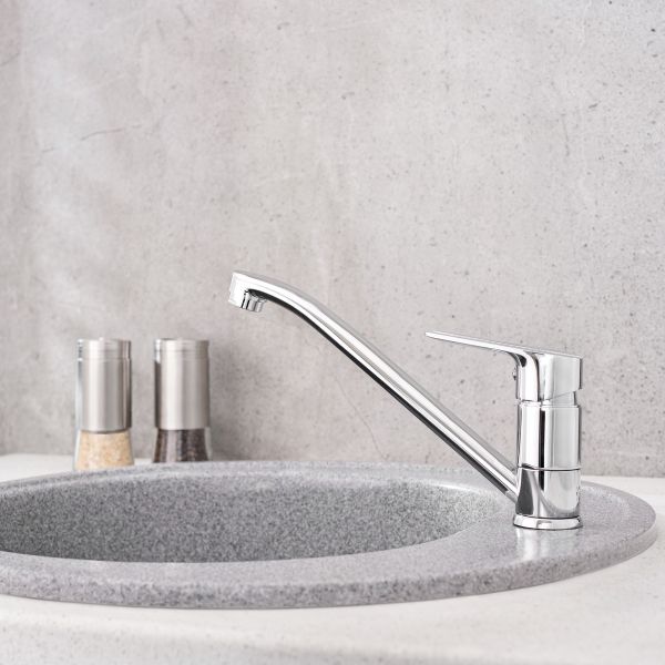 Классический однорычажный смеситель для кухни с длинным изливом, дополненный оригинальным оформлением ручки смесителя, станет функциональным и привлекательным дополнением кухни.