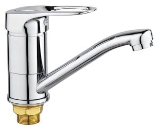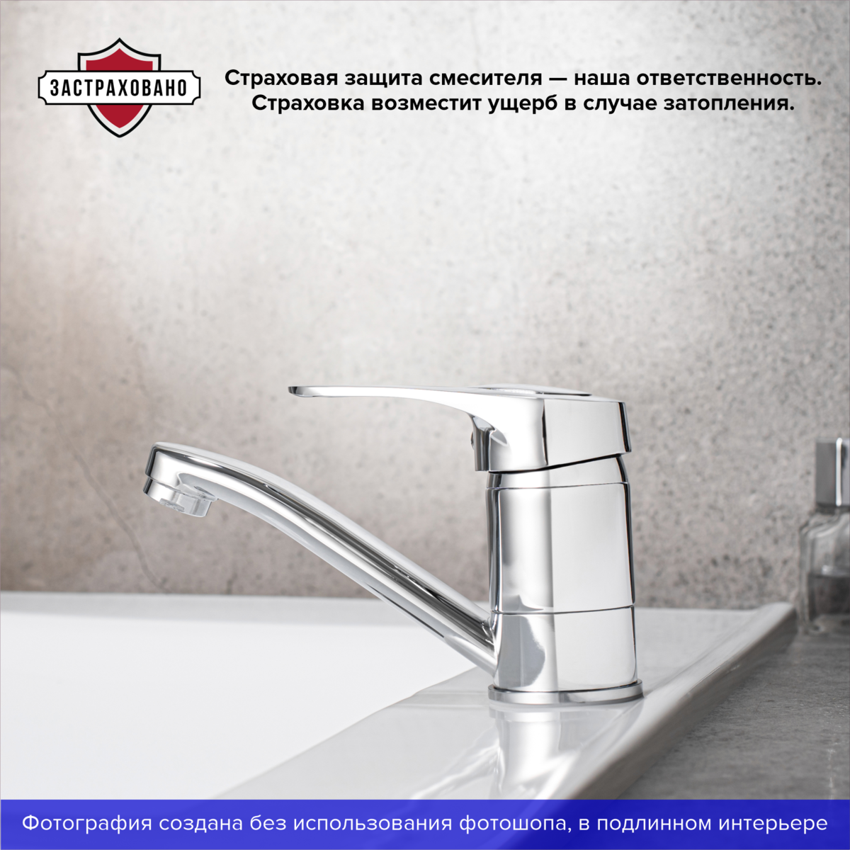 Однорычажный смеситель для кухни с коротким поворотным изливом имеет четкие, плавные линии, удобен в использовании и станет стильным элементом интерьера.