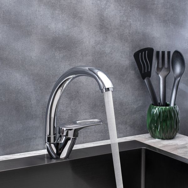Классический однорычажный смеситель для кухонной мойки с высоким поворотным изливом станет надежным и эффективным решением для вашего интерьера.