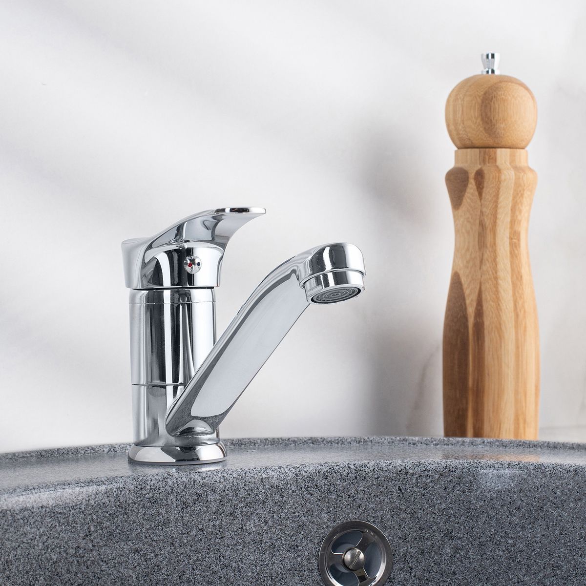 Однорычажный смеситель для кухни с коротким поворотным изливом обладает стильным минималистичным дизайном и гармонично подчеркнет интерьер вашей кухни.