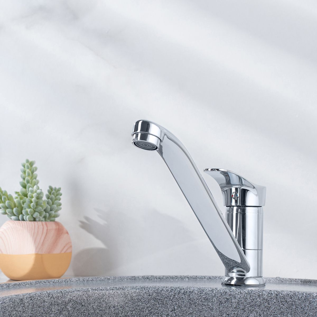 Однорычажный смеситель для кухни с длинным поворотным изливом обладает стильным минималистичным дизайном и гармонично подчеркнет интерьер вашей кухни.