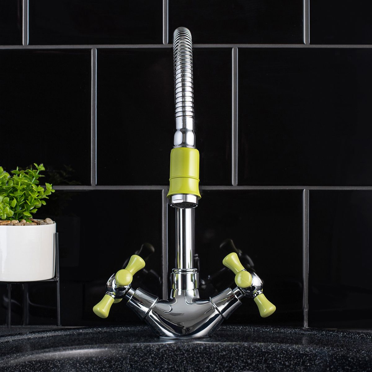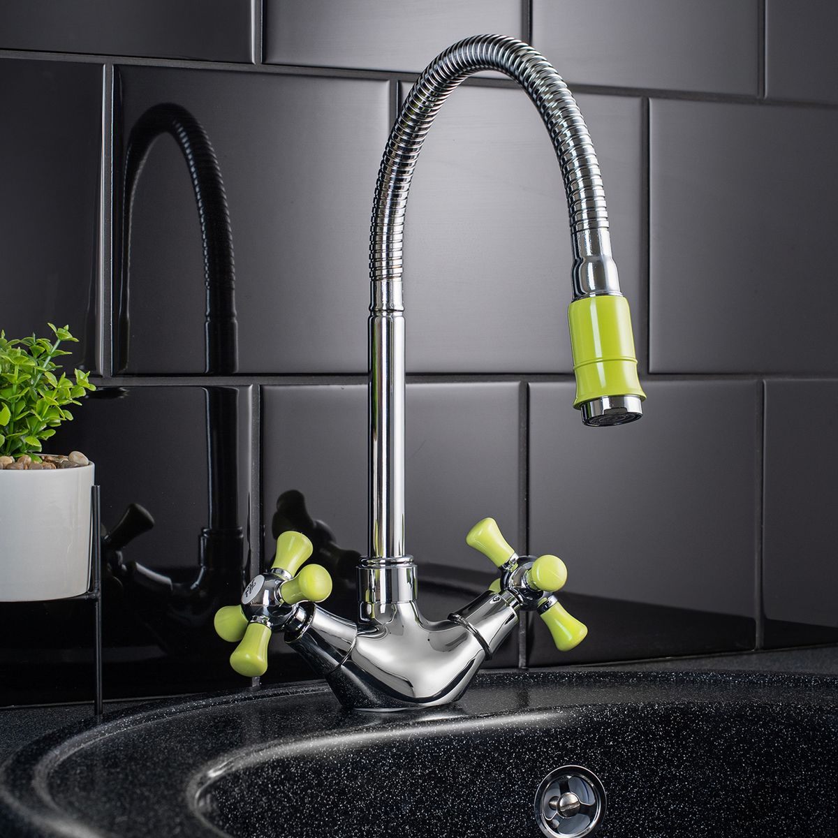 Функциональный двуручковый смеситель для кухни с высоким гибким изливом порадует оригинальными цветовыми фрагментами оформления и станет стильным решением для вашего интерьера.