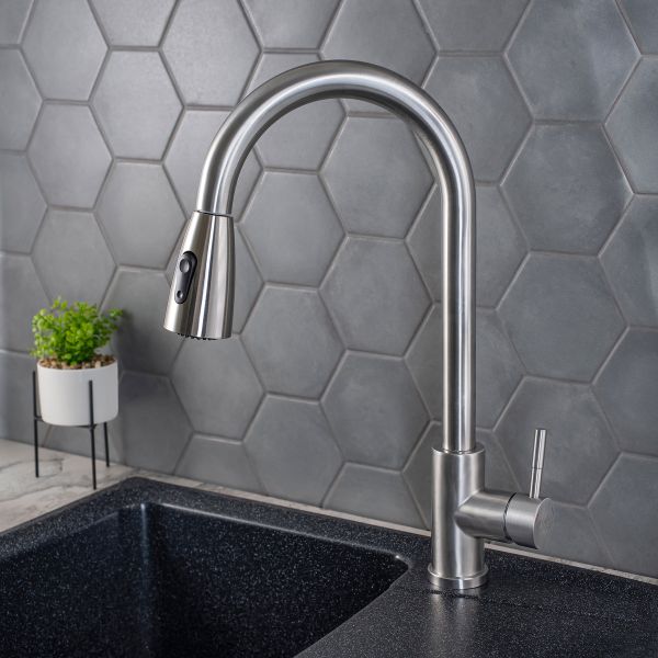 Однорычажный смеситель из нержавеющей стали с высоким выдвижным изливом обладает насадкой аэратором с двумя режимами подачи воды станет незаменимым помощником на вашей кухне.