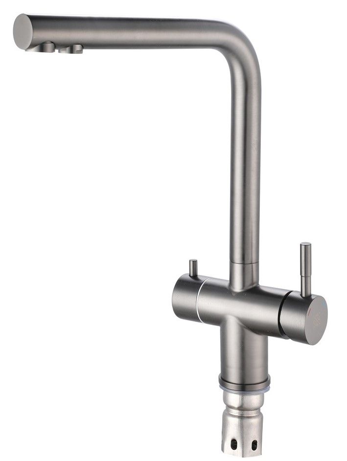 Смеситель для кухни с переключением фильтра для питьевой воды с высоким поворотным изливом это не только стилистическое, но и функциональное решение для оснащения кухни. При производстве смесителей ТМ РМС используются только высококачественные материалы. Смесители серии SUS127 выполнены из нержавеющей стали, что является гарантией качества и долговечности, устойчивы к царапинам и перепадам температур, экологичны и безопасны для вашего здоровья, Поверхность не потеряет со временем свой роскошный вид, а уход за ней сводится к протиранию мягкой салфеткой. Установка смесителя крайне проста. Смесители РМС это сертифицированный продукт с 7-летней гарантией. Гибкая подводка идет в комплекте.