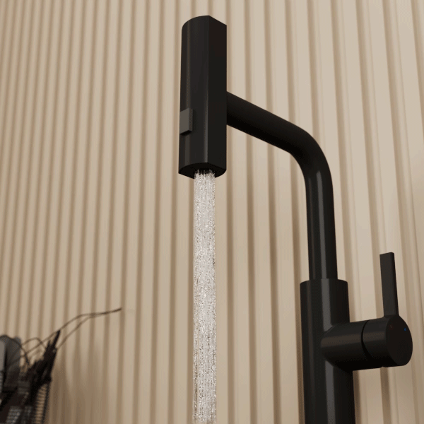 Смеситель для кухни с высоким поворотным изливом и вытяжной лейкой 3-функц. RUSH Tinos арт.TI3732-18Black цвет матовый черный с металлической ручкой изготовлен из нержавеющей стали SUS304 и имеет рычажное управление. В смеситель установлен картридж D-35 с керамическими пластинами. Высота смесителя 398мм. Излив поворотный и вытяжной с поворотной лейкой с 3 функциями. Высота излива до аэратора 257мм. Аэратор изготовлен из пластика. В комплекте гибкая подводка с гайками 60 см - 2шт, универсальная присоединительная группа, индивидуальный пакет, паспорт, гарантийный талон.