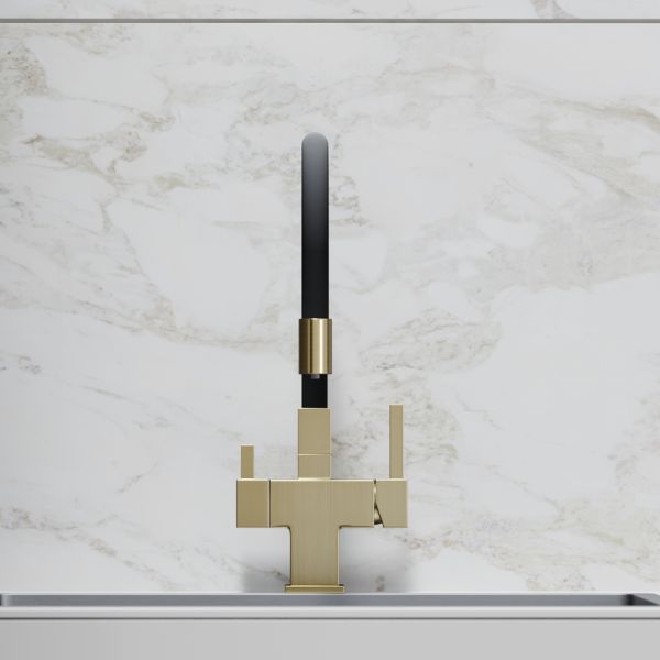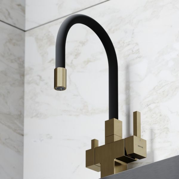Смеситель для кухни SANCOS Arno с гибким изливом и возможностью подключения фильтра для воды, цвет брашированное золото, арт. SC4005BGФункция "Холодный старт" - при включении смесителя активируется холодной поток, для экономии горячей водыАэратор, гибкая подводка, ключ и крепления для монтажа