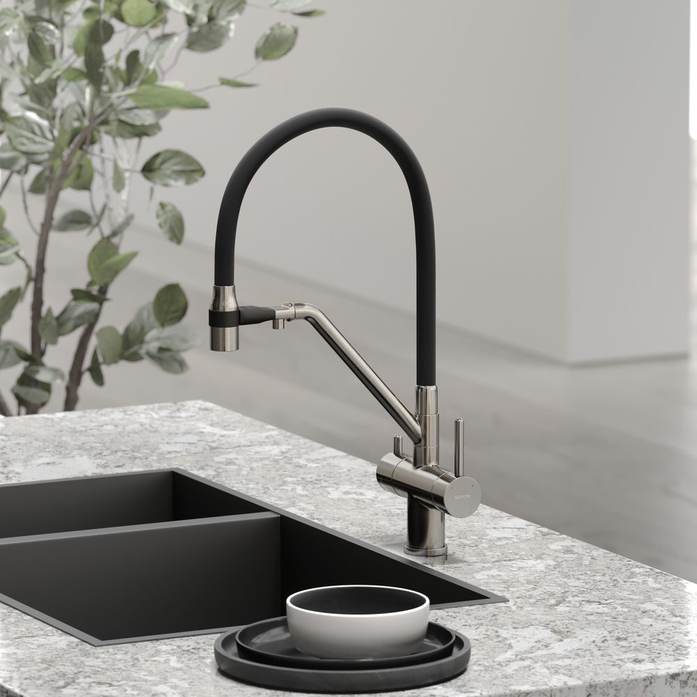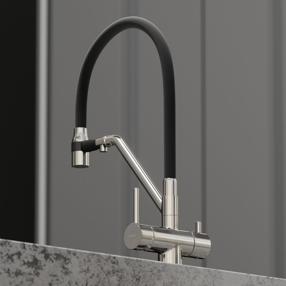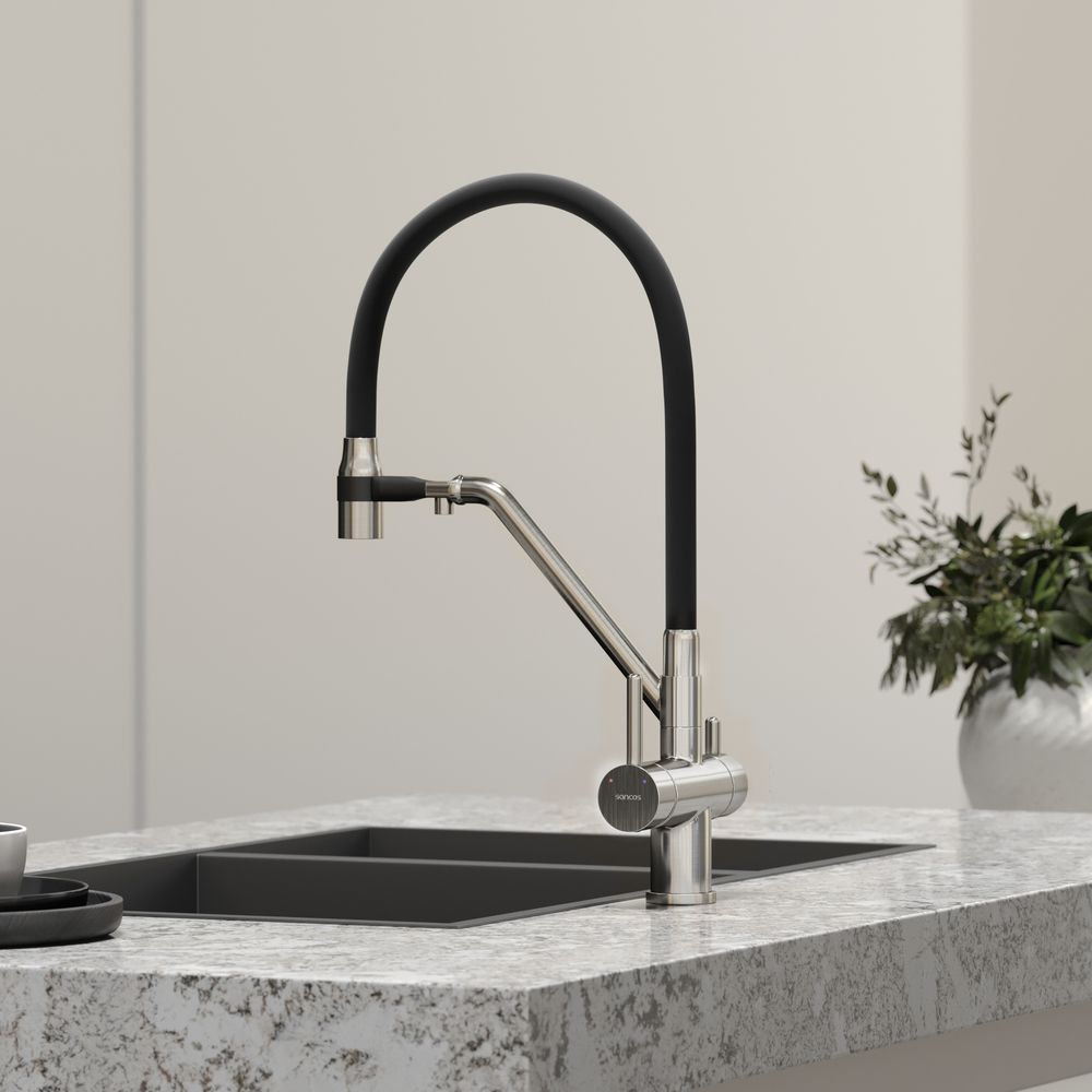 Смеситель для кухни SANCOS Dora с гибким изливом и возможностью подключения фильтра для воды, цвет брашированный никель, арт. SC4003BNС возможностью регулировки температуры водыАэратор, гибкая подводка, ключ и крепления для монтажа