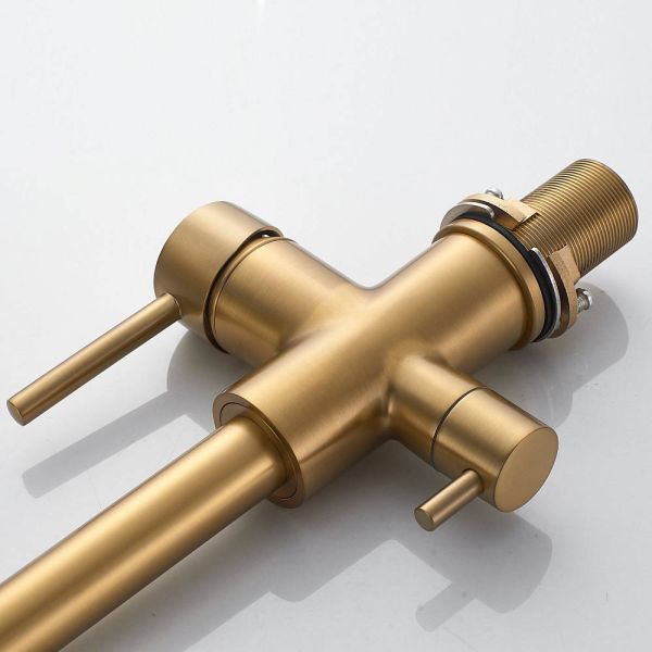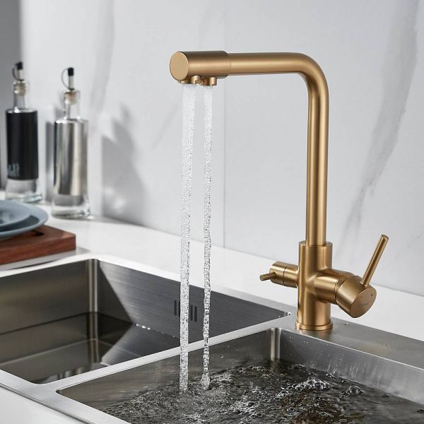 Во-первых, цвет "золотой сатин" подойдет к любому дизайну кухни и будет гармонично смотреться в любом интерьере. Во-вторых, поворотный излив позволит легко настроить струю воды под любые ваши нужды, а встроенный канал для питьевой воды облегчит процесс фильтрации и подачи воды.