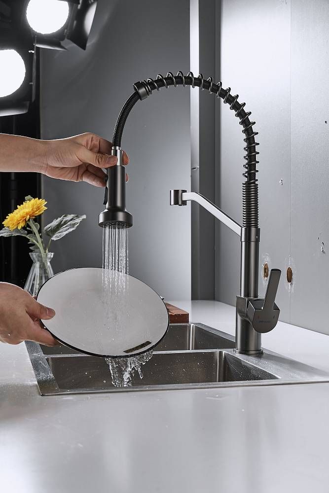 Смеситель для кухни с гибким изливом Shevanik S963T, оружейная сталь.Управление: рычажное.Вращение излива: да.Выдвижной излив: нет.Гибкий излив: да.Высота:44.
