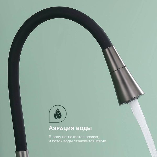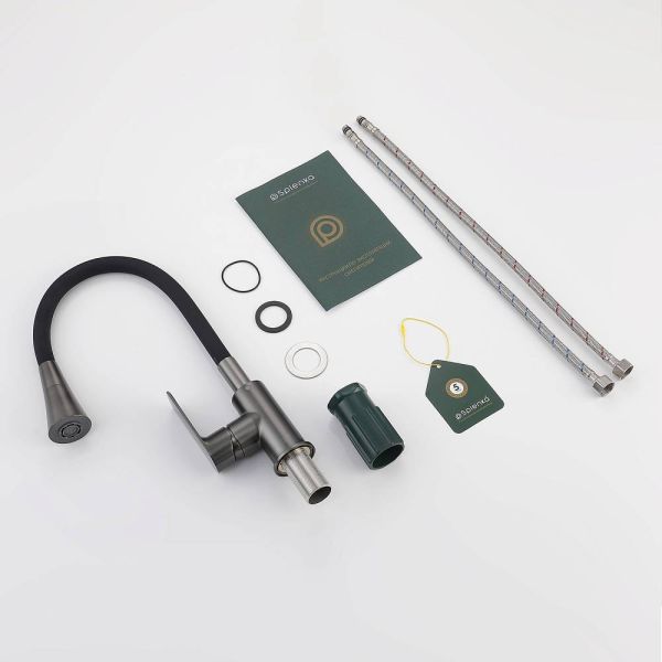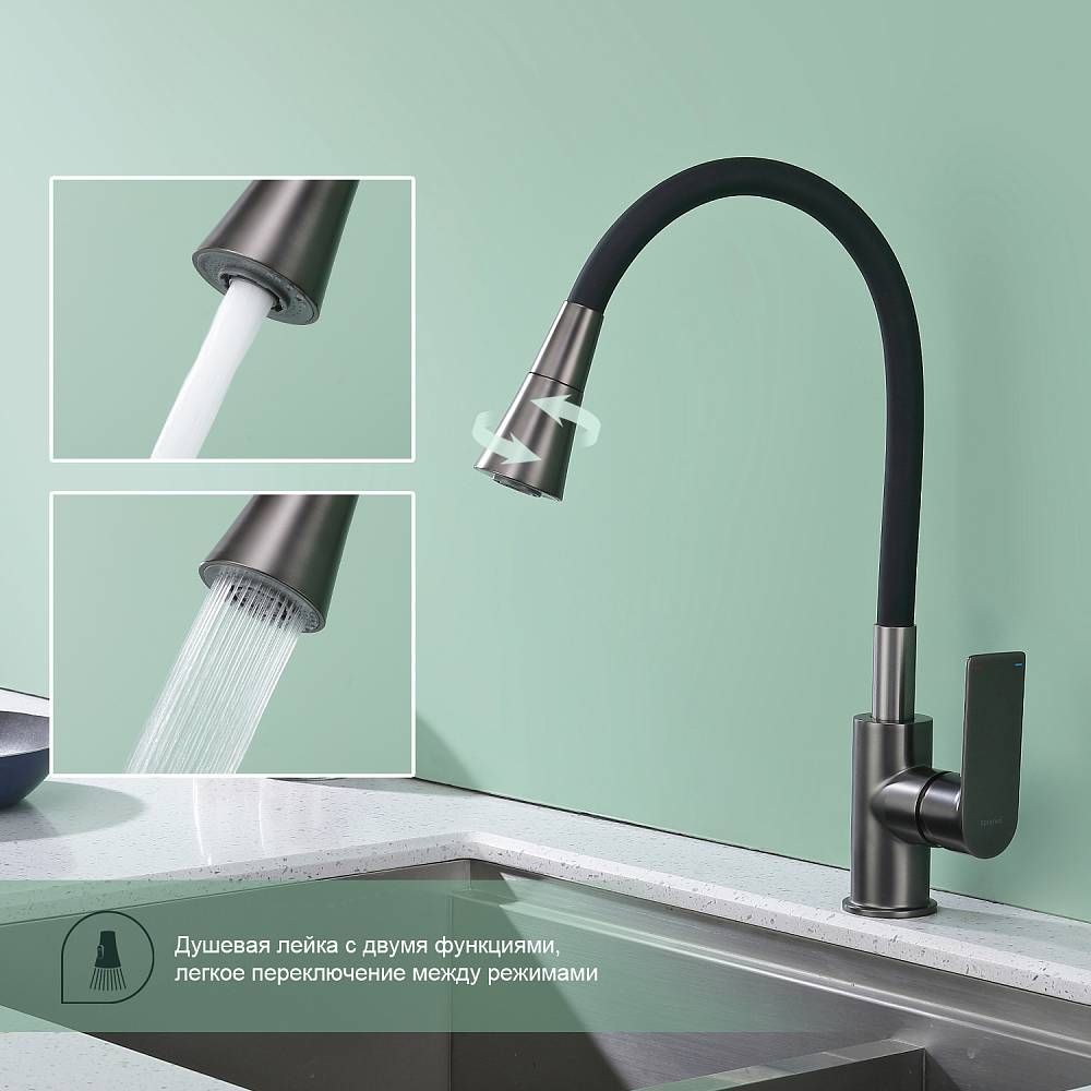 Смеситель для кухни Splenka S05.43.09 идеально подходит для кухонной мойки, раковины любого типа. Цвет: графит. Смеситель имеет 2 режима: поток воды и душ. Кран с гибким изливом имеет необычный внешний вид и особую конструкцию. С помощью гибкого шланга можно самостоятельно регулировать глубину выноса и высоту излива, что позволит избежать лишнего разбрызгивания воды. Также с помощью силиконового излива не составит труда добраться до всех мест в мойке, что упрощает мытье посуды и продуктов. Стильный латунный смеситель имеет свойство шумоподавления.